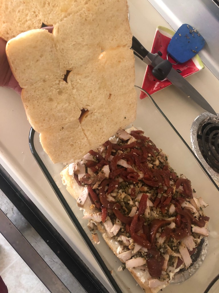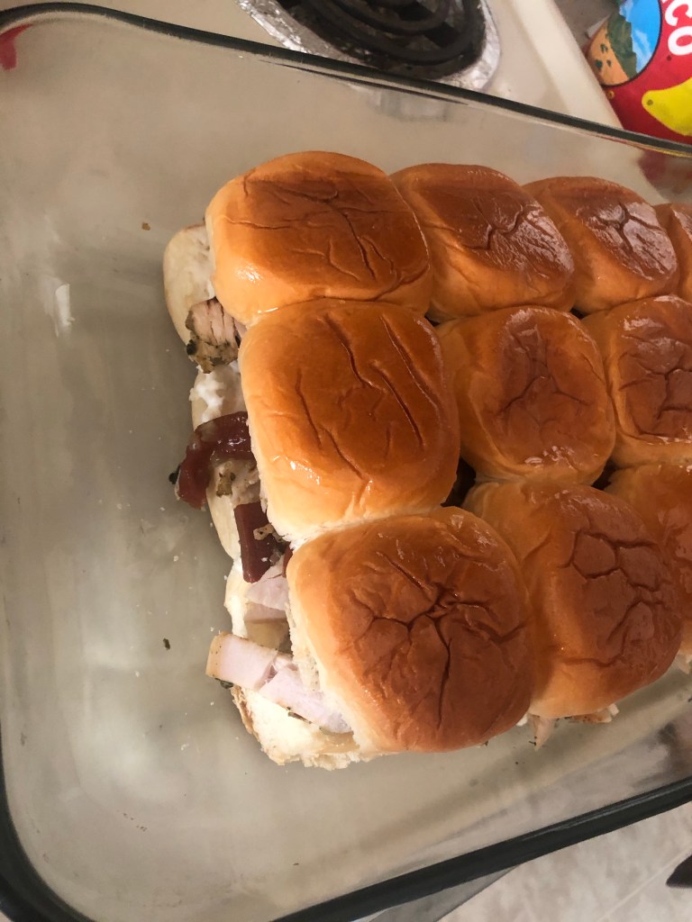 Take a tray of Hawaiian rolls, cover with tasty ingredients, heat through in an oven, and start chomping.