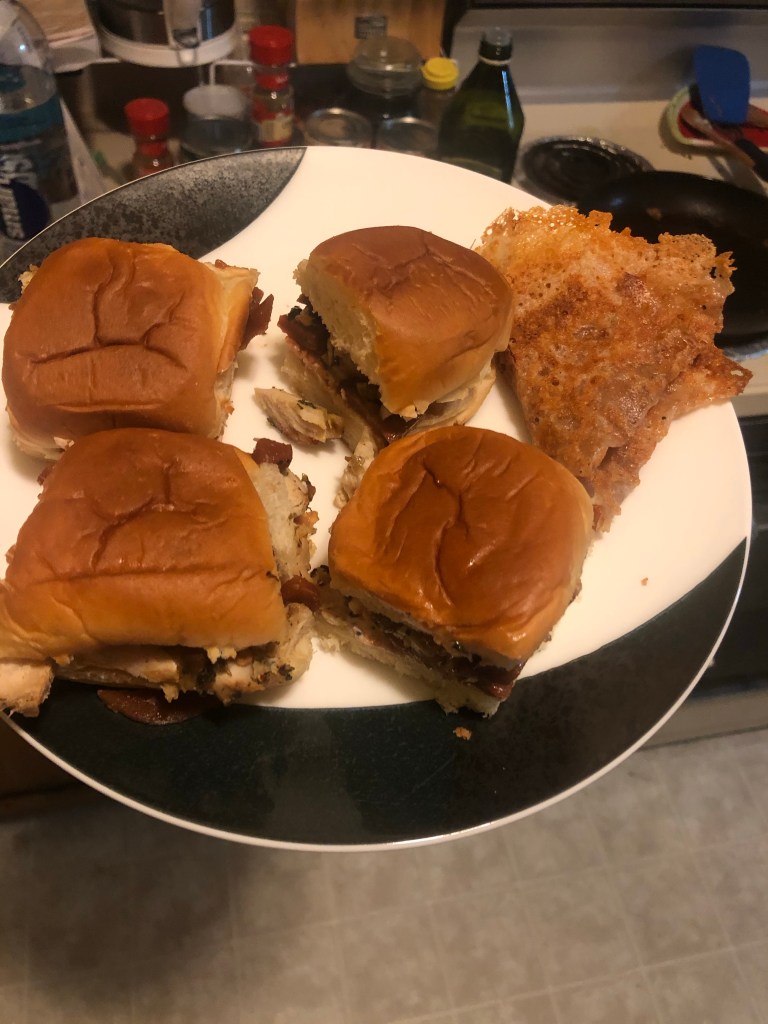 Hawaiian rolls are a good fit here because they’re slider sized and the sweetness goes well with everything else, but changing up the bread would likely change the character of the whole sandwich in fun ways.